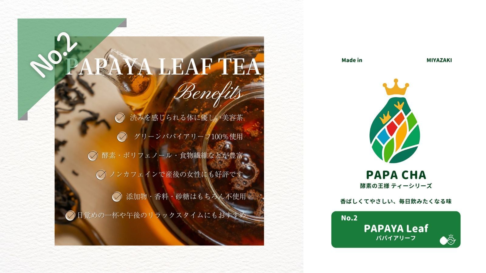 栽培期間中農薬を使わず育てた宮崎産の青パパイヤの葉のみを贅沢に使用したヘルシーティーです。青パパイヤの葉にはポリフェノールやビタミンC、酵素など抗酸化作用のある成分が豊富に含まれており、免疫ケアや美容を意識する方に最適です。また、製法上の工夫で青パパイヤ葉特有の苦味を抑え,香ばしくまろやかな風味に仕上げているため、毎日飲みやすいのもポイントです。