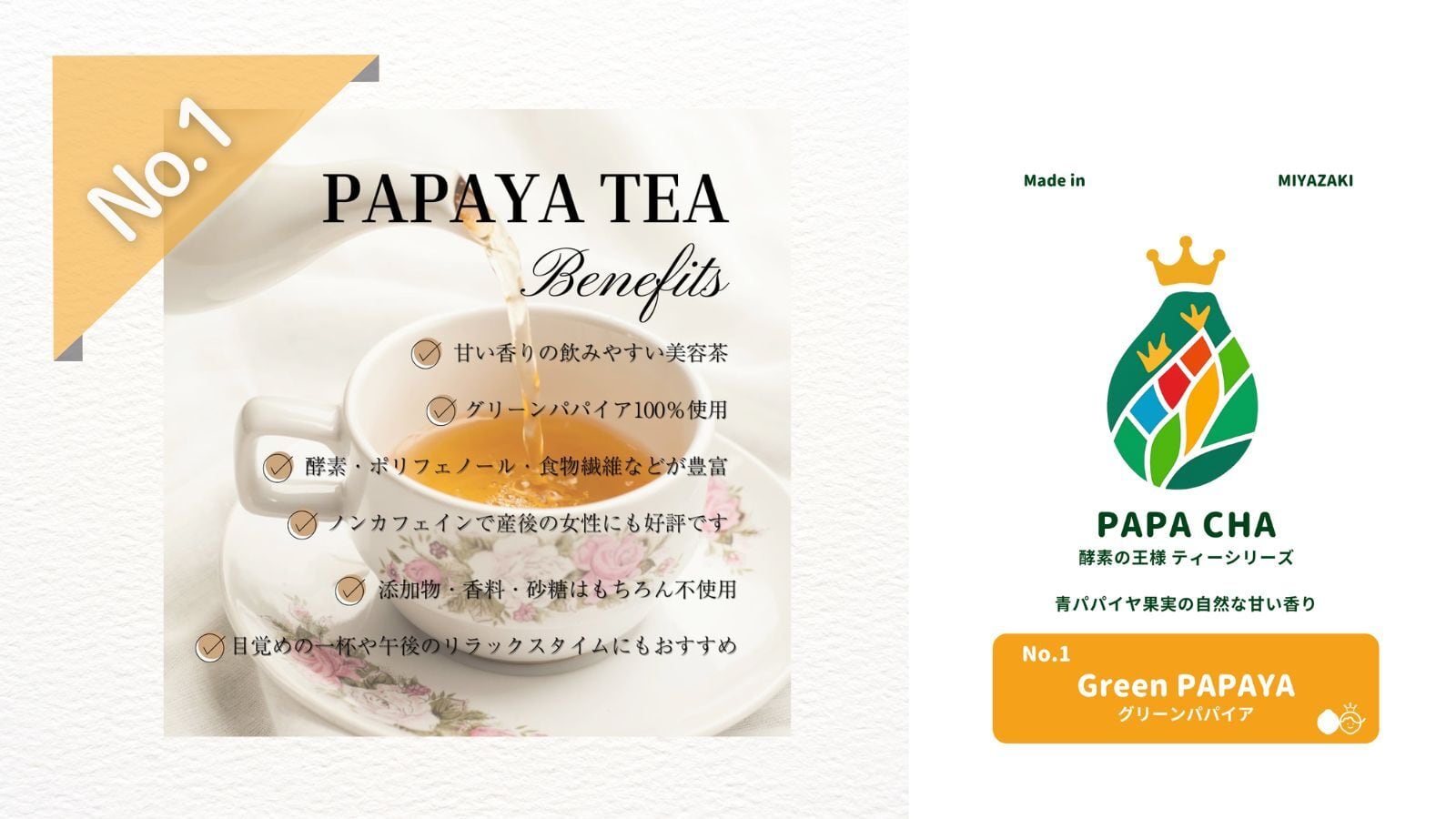 宮崎県産の青パパイヤ果実を100%使用したシリーズ原点の美容茶です。青パパイヤならではの自然な甘みと芳醇な香りが特長で、リラックスしたい時や就寝前にも安心して飲めるノンカフェインティーです。酵素やビタミンC、食物繊維など栄養もしっかり摂れるため、毎日の健康習慣として幅広い世代に支持されています。