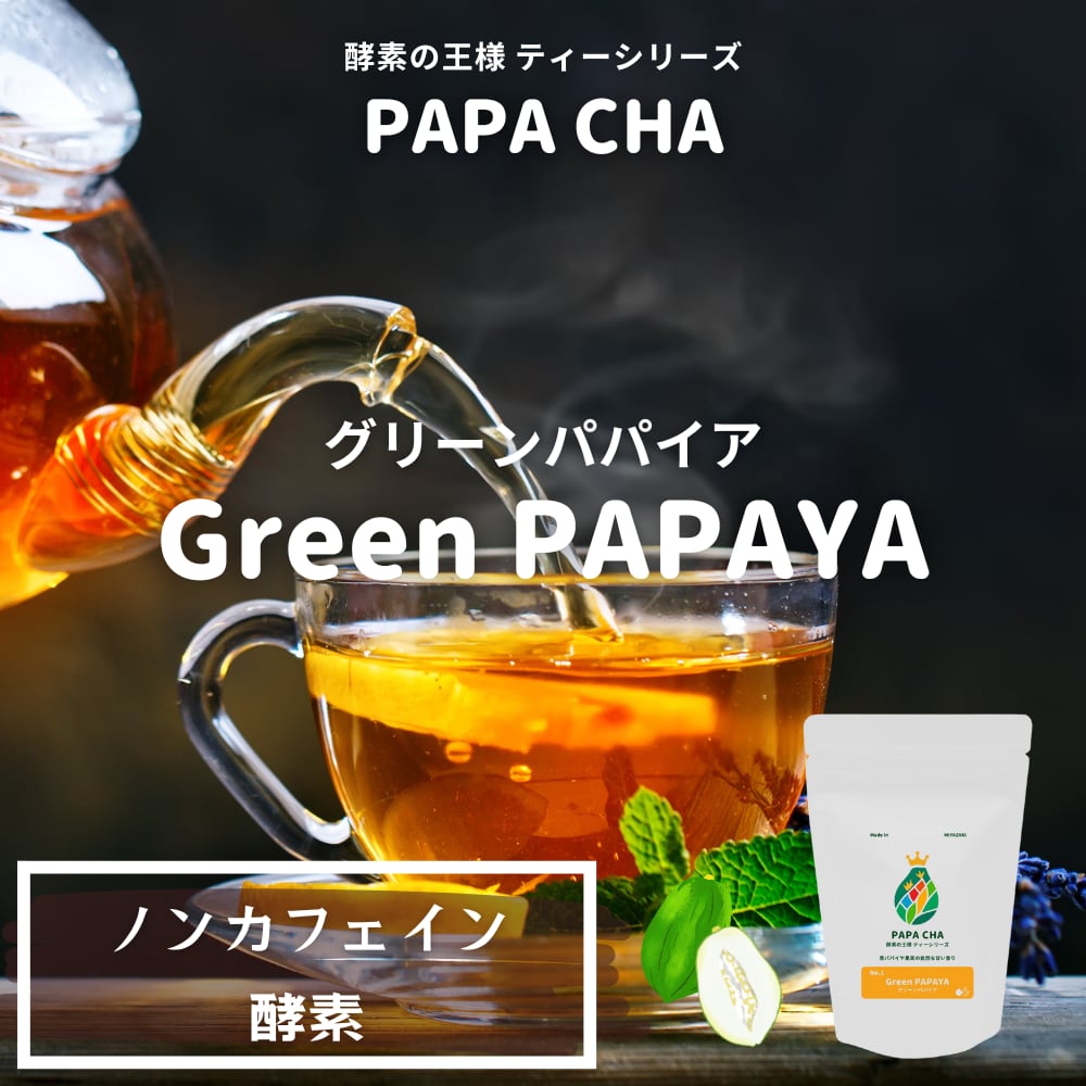 宮崎県産のグリーンパパイヤを100%使用し、ノンカフェイン・添加物や化学調味料不使用で仕上げた、毎日に寄り添う「やさしいお茶」です。