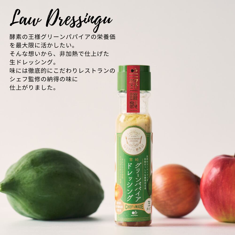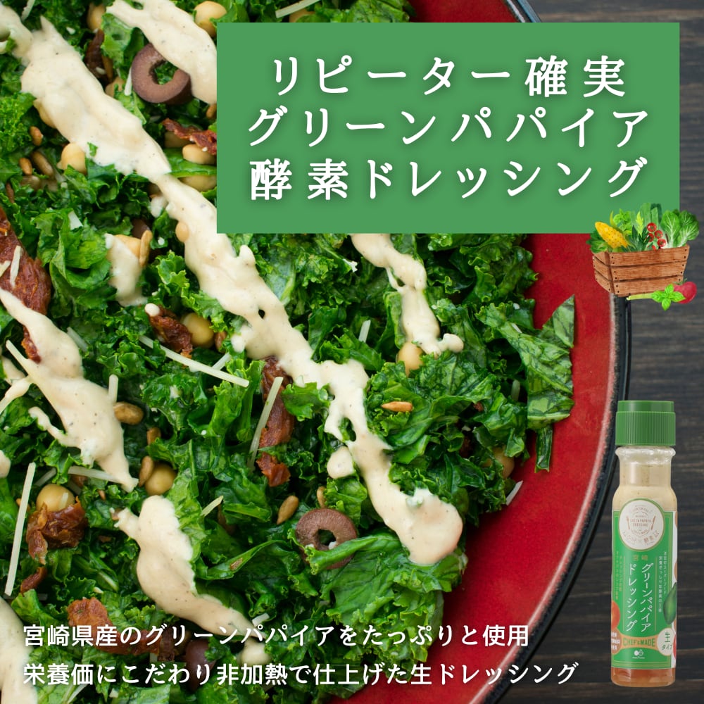 グリーンパパイア酵素ドレッシングは、宮崎の自然の恵みをそのまま詰め込んだドレッシングです。おいしさ、健康、そして安心をお届けするために、一切の妥協を許さずに作られています。毎日の食卓に、ちょっとした贅沢と健康を加えてみてはいかがでしょうか。